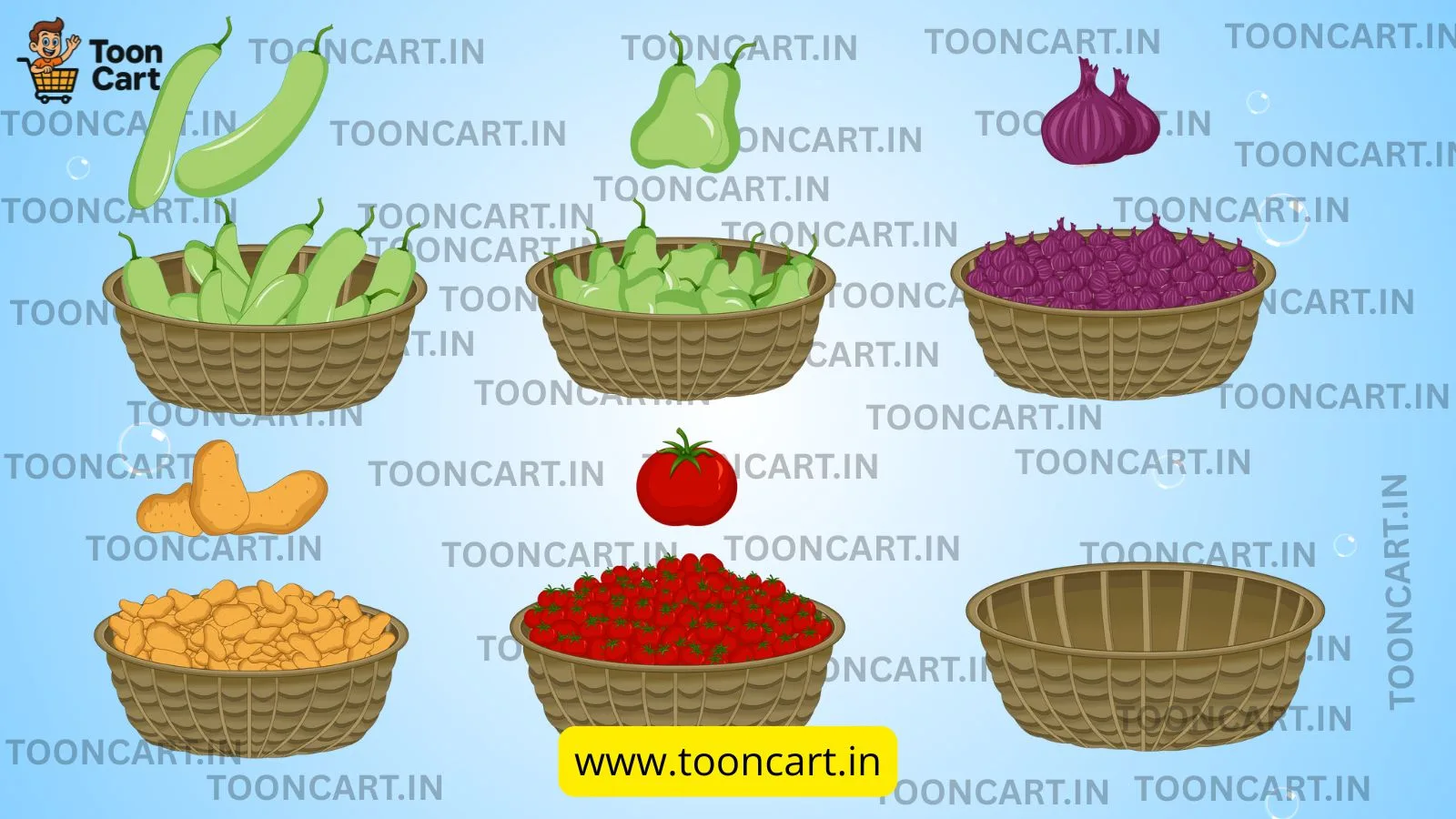 Bring your educational or creative projects to life with this ready-to-edit FLA file made in Adobe Animate CC. The pack contains beautifully drawn, fully vector vegetables in traditional baskets — bottle gourd, green capsicum, onion, turmeric, tomatoes and an empty basket for custom use.